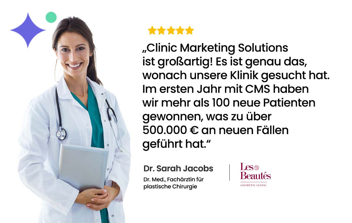 Wir bringen alles in Ihre Klinik: individuelles Branding, optimierte Website, Patientenverwaltungstools, SEO, soziale Medien und bezahlte Werbung. Alles für eine erschwingliche monatliche Gebühr und Ihre Klinik ist in nur 7 Tagen live!